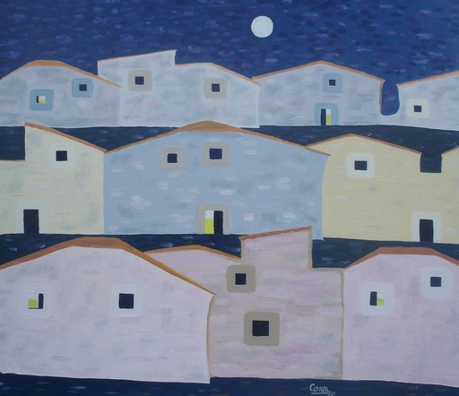 De sfeer van Spaanse dorpen en landschappen beïnvloeden mijn werk. Door een belangrijk overwicht van kleuren te gebruiken en te spelen met contrasten, tracht ik een magische wereld te creëren die vooral vrolijkheid uitstraalt. Ook maak ik gebruik van het gevoel van geluk wat ik voel als ik schilder.